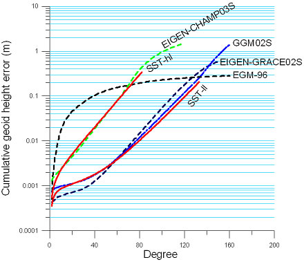 模拟仿真系统给出的SST-hl和SST-ll仿真模拟结果与现有重力场模型的大地水准面累积误差比较