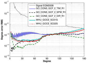 联合GOCE SGG和SST数据研制的WHU_GOCE_SC01S、WHU_GOCE_SC02S模型的阶误差RMS,模型精度整体上优于ESA发布的同阶次时域解模型GO_CONS_GCF_2_TIM_R1