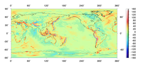 由GRACE数据基于能量守恒法研制的卫星重力场模型WHU-GM-05描述的重力异常,模型精度与同期的GGM系列模型精度水平相当(单位:毫伽)