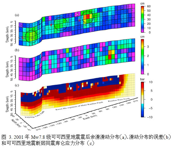 3) 利用高级时序InSAR分析技术获取了2001年可可西地震的震后InSAR形变场,该震后形变场的时间跨度为2003-2008年,覆盖区域为300 km×400 km,震后形变最大达8 cm,精度为1-2 mm/yr,是迄今为止覆盖区域最广、精度最高的InSAR震后形变场;采用震后余滑、粘弹性松弛和混合模型分析了该地震的震后形变机制。